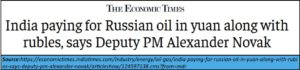 Because relations between China and India have not been particularly warm – they have been thawing lately – nobody expected India to agree to pay for Russian oil in RMB. Though it will continue paying for this oil in Rubles as well (https://www.taxtmi.com/news?id=58968).