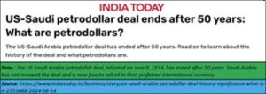 Saudi Arabia is the largest player in the oil market. It was a key player along with the US in creating the petrodollar in 1974. While the petrodollar deal expired in 2024, the formal agreement to denote oil purchases in RMB was a clear definitive step away from the US dollar. Equally shocking was India’s move.