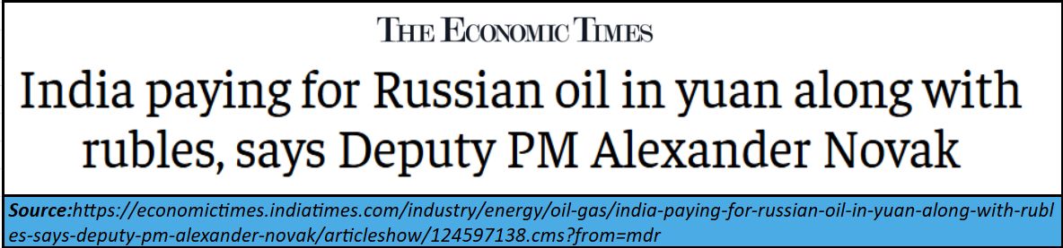 Because relations between China and India have not been particularly warm – they have been thawing lately – nobody expected India to agree to pay for Russian oil in RMB. Though it will continue paying for this oil in Rubles as well (https://www.taxtmi.com/news?id=58968).