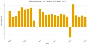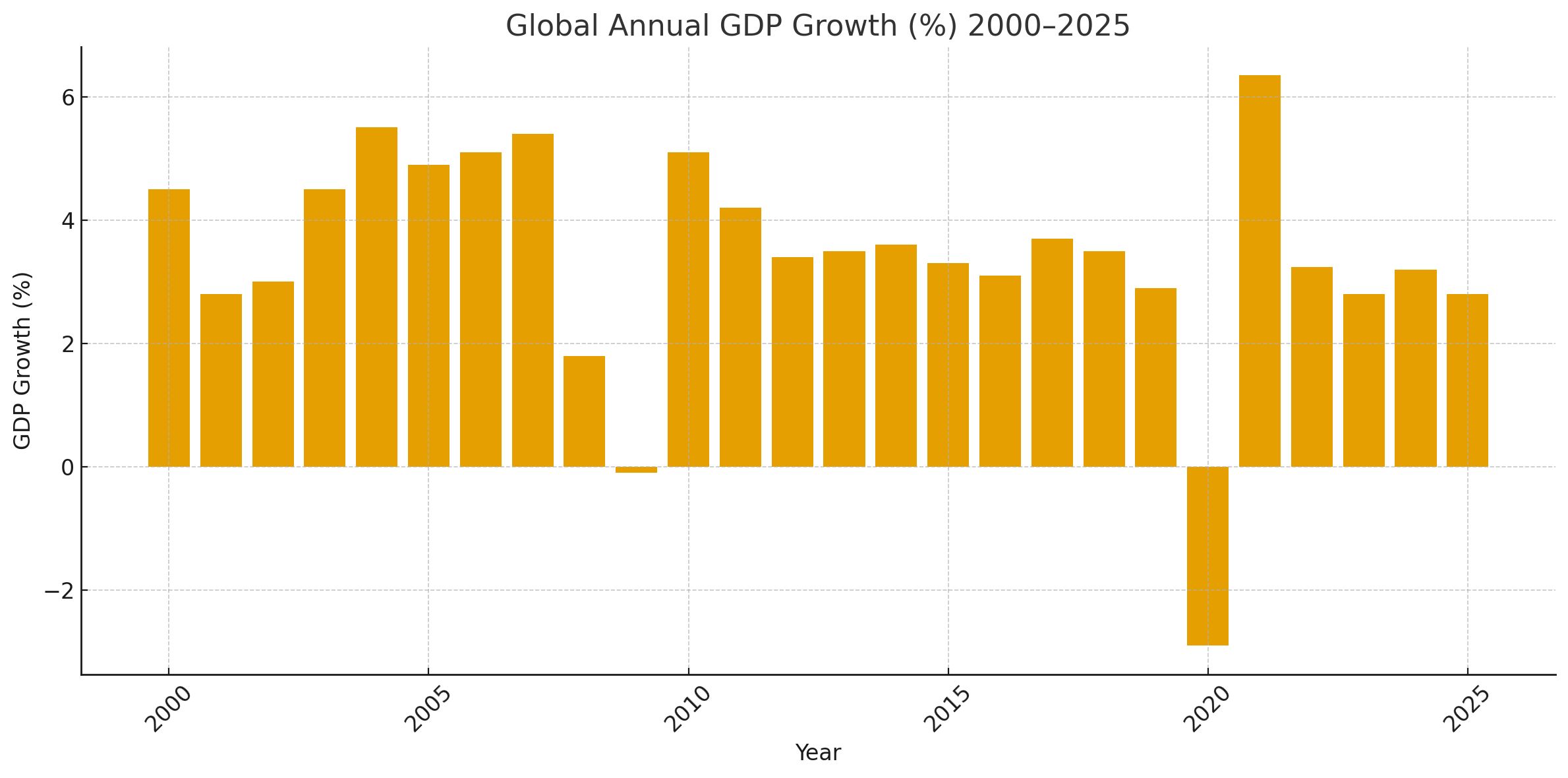 Barring two dips in 2009 (post the 2008 GFC) and 2020 (Covid shut down) global GDP growth has been at around 4% a year.