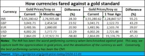 A very interesting picture emerges when one considers the price of gold in different currencies. For purpose of convenience, we have taken INR, GBP, EUR, USD and CNY. Study the numbers. Observe how the maximum appreciation in gold prices has been with the Indian rupee. Thus, while gold prices climbed 47.06% in Dollar terms, they climbed 55.25% in Rupee terms. Interestingly, gold prices climbed only minus 85.22% in the Chinese currency. Suggesting that China’s currency appreciated against gold while other major currencies, including the Indian rupee, weakened.