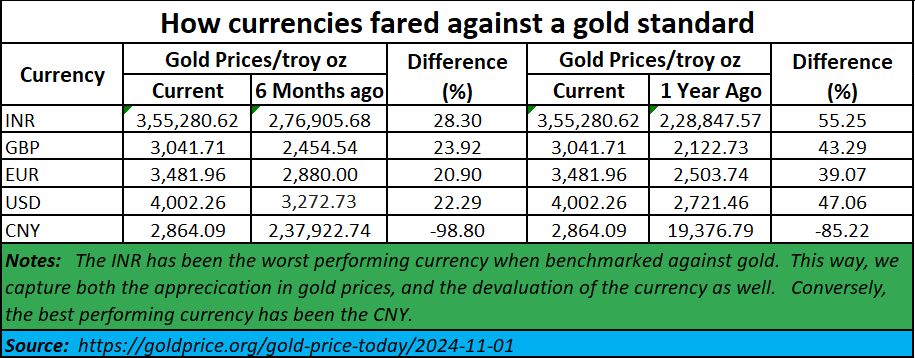 A very interesting picture emerges when one considers the price of gold in different currencies. For purpose of convenience, we have taken INR, GBP, EUR, USD and CNY. Study the numbers. Observe how the maximum appreciation in gold prices has been with the Indian rupee. Thus, while gold prices climbed 47.06% in Dollar terms, they climbed 55.25% in Rupee terms. Interestingly, gold prices climbed only minus 85.22% in the Chinese currency. Suggesting that China’s currency appreciated against gold while other major currencies, including the Indian rupee, weakened.