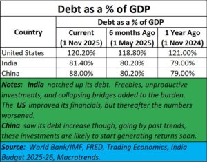 Sadly, India’s debt has been growing not because of investments in productive areas. That would have led to a surge in GDP, and would be welcome. Instead, India’s debt has climbed because of not-so-productive uses of money. The government has splurged on subsidies and freebies, and on projects that have little economic value (https://asiaconverge.com/2019/04/doles-elections-corruption/). Though the government tries to explain away these expenses as social development costs, the truth is not as rosy. Subsidies and freebies eventually teach a population not to work. Thus, these freebies have blighted an entire generation severely eroding the much-touted demographic dividend that the country could have enjoyed.