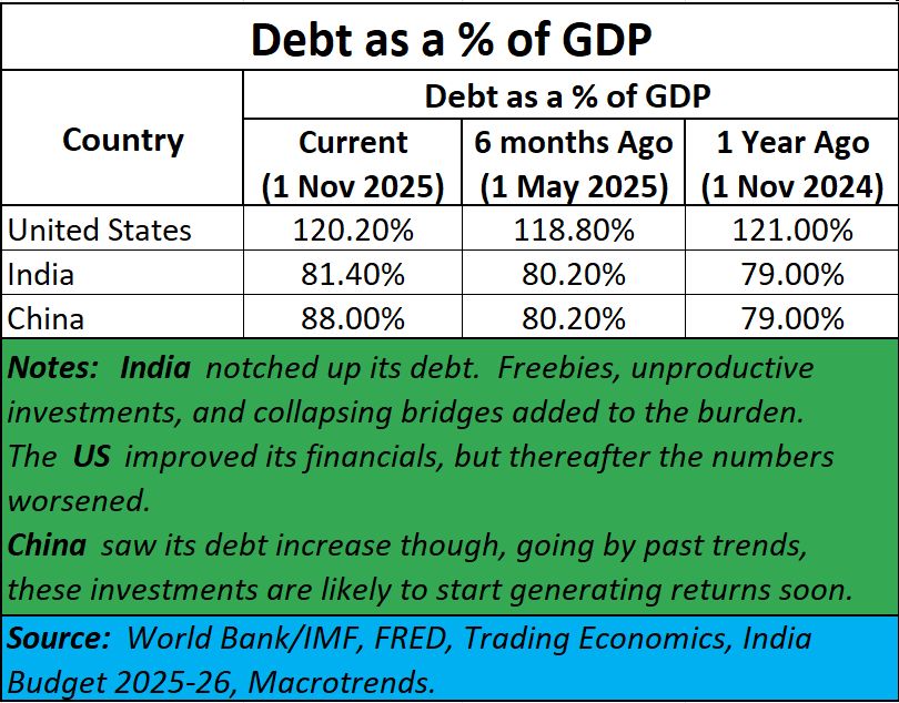 India’s weakness is also evident from the manner in which debt has grown. Though overall, India’s debt to GDP is not as large as that of the US or Japan, the situation is worrisome.