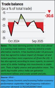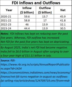 A myopic view of trade, made India scrap over three dozen BITs (Bilateral Investment Treaties) in 2016 (https://asiaconverge.com/2020/01/arbitration-and-investment-protection/). That decision coupled with the worsening license raj shooed away investments that should have come to India. An inspector raj culture frightened Indian businessmen away as well. As a result, inbound FDI declined and Indian promoters began pushing their money overseas. By August 2025, India had a negative net FDI position. Another reason was that India’s imports became larger than its exports.