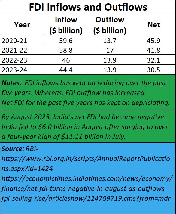 A myopic view of trade, made India scrap over three dozen BITs (Bilateral Investment Treaties) in 2016 (https://asiaconverge.com/2020/01/arbitration-and-investment-protection/). That decision coupled with the worsening license raj shooed away investments that should have come to India. An inspector raj culture frightened Indian businessmen away as well. As a result, inbound FDI declined and Indian promoters began pushing their money overseas. By August 2025, India had a negative net FDI position. Another reason was that India’s imports became larger than its exports.