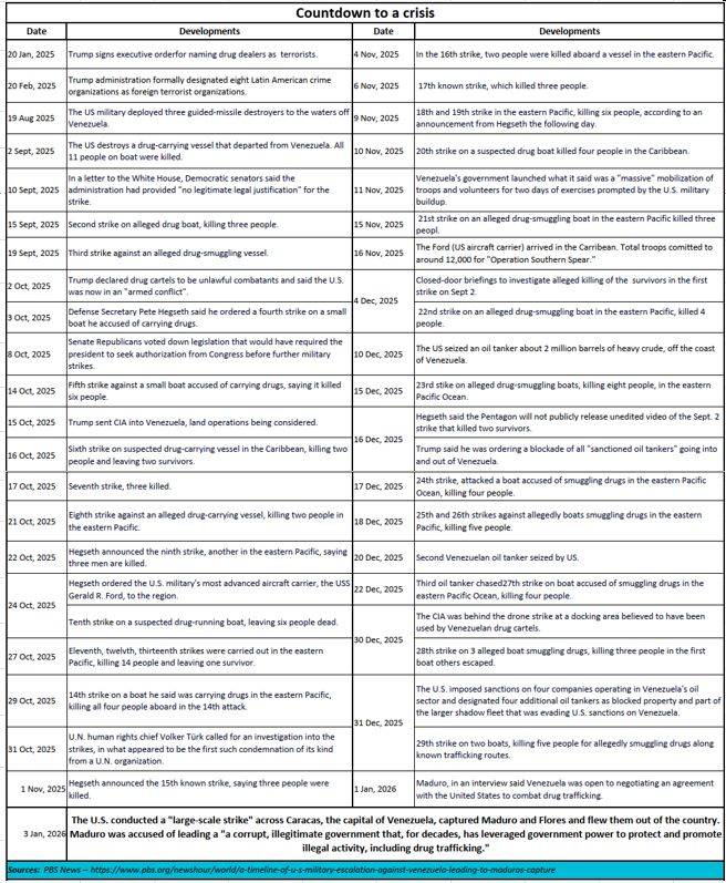 - ‘It was a law-enforcement operation, not a war’. A brazen lie. Why were the war ships stationed near the coast of Venezuela? Why were 12,000 troops kept on standby? Why were several buildings bombed? Why were 80-100 people killed? The US has now invented a new definition for law enforcement which allows it to stage 29 incidents (now 30) of shooting down boats in international waters, and authorise the extra judicial killing of over a 100 people in those boats. Thus, the US did violate laws. It did not enforce them. There was a total disregard for human lives. As for ‘law-enforcement’, do listen to Scott Ritter, former UN arms inspector, when he says (timeline 6:43 to 6:49 at https://www.youtube.com/live/8O49reYeJRw) that the US has stopped behaving as a constitutional republic. Its acts against oil tankers were nothing short of plain piracy.