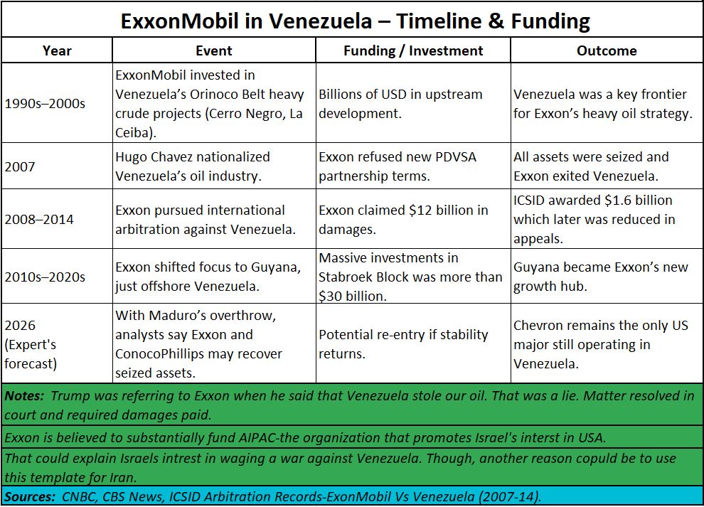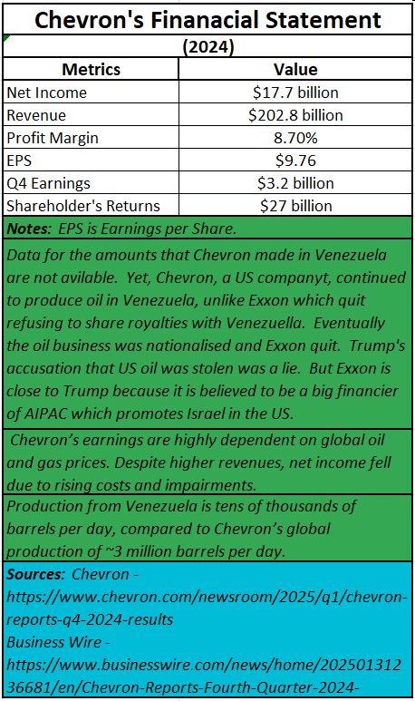 Chevron, another US company continues to operate in Venezuela. But Exxon is closer to Trump because it is said to be financing AIPAC, the organization that lobbies for Israel’s interest in the US.