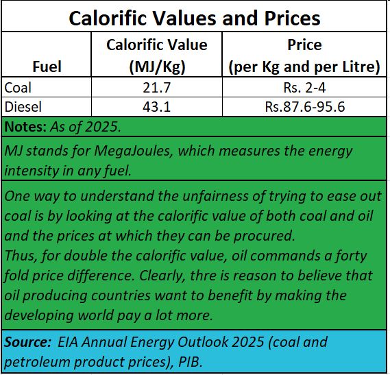 Most developed countries have been insisting that India reduce its coal consumption. They often advocate the use of oil instead. But oil is frightfully expensive. One good way of comparing the price of oil with that of coal is by looking at their respective calorific values.