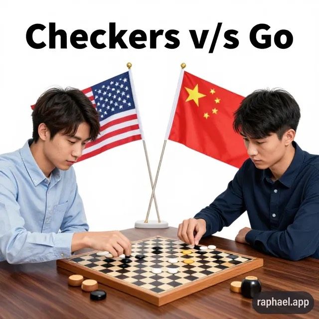 Checkers, a board game, popular in America, whose aim is to capture the opponent’s pieces or block them. The game is tactical and focused on immediate threats.