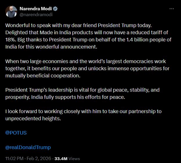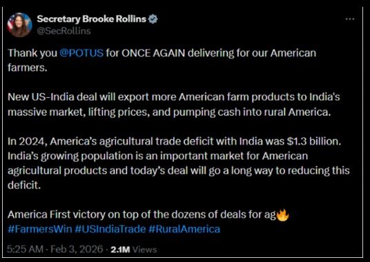 Just look at this tweet from Secretary Brooke Rollins, US Secretary of Agriculture, she thanks the US president for protecting the interest of US farmers. (https://x.com/SecRollins/status/2018473256122986610)  One wonders of Indian farmers would do the same for the Indian prime minister. Effectively, the Indian government appears to be working for the US farmers and not Indian farmers.