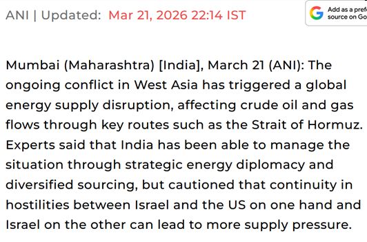 https://www.aninews.in/news/business/west-asia-conflict-has-disrupted-energy-supply-chains-india-leveraging-diplomacy-to-secure-oil-and-gas-flows-experts20260321221440/?amp=1