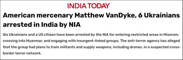 India Today (https://www.indiatoday.in/india/story/american-mercenary-matthew-van-dyke-six-ukrainians-arrested-india-nia-myanmar-junta-2883373-2026-03-17) described the American as a mercenary names Matthew Van Dyke. The NIA alleged that the group had plans to train militants and supply weapons, including drones, in a suspected cross-border terror network.
